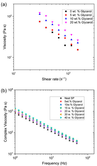 Impact of glycerol on the rheological properties of SPI-based formulations containing no polysaccharide at 75 °C: (a) viscosity versus shear rate characterized by capillary rheology; (b) complex viscosity versus frequency characterized using dynamic shear rheology.