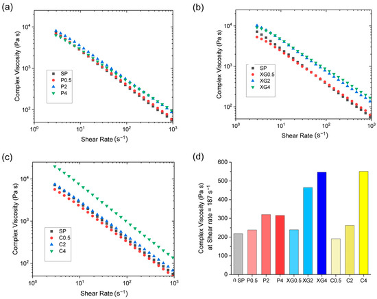Impact of polysaccharide type and concentration on the apparent shear viscosity versus shear rate for (a) pectin, (b) xanthan gum, and (c) carrageenan composites at 75 °C. (d) shows bar chart of the complex viscosity at a shear rate of 187 s−1 with varying concentrations of polysaccharides.