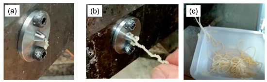 Photographs of different kinds of extrusion behaviors observed in the experiments: (a) little or no extrusion; (b) formation of brittle irregular filaments; and (c) formation of smooth continuous filaments.