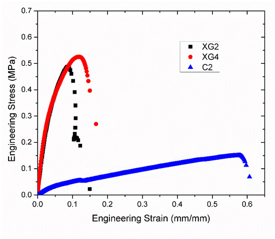 Representative stress–strain curves of protein-polysaccharide fibers measured in a tensile test for formulations XG2, XG4, and C2.