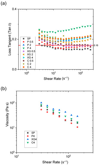 The frequency dependence of the tan δ values of the formulations produced at 75 °C is shown in Figure 8a. Under these conditions, only the two formulations containing low pectin concentrations did not flow out of the extruder. These two formulations exhibited the lowest tan δ values below 0.16. All the formulations that had tan δ values exceeding 0.16 could be extruded from the microcompounder. It is hypothesized that this shift towards a more viscous response of the formulation may be related to the ability of the material to flow out of the extruder; a similar trend was also observed at 50 °C. Such a distinction was not evident in any other rheological parameter (G′ or G″ or η*), implying that the change in the viscoelastic response is a better indicator for SPI extrudability than the absolute magnitude of the viscosity itself.