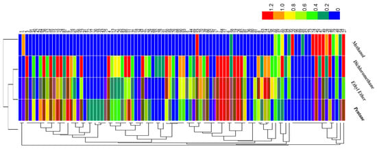 In Table 2, the detected sulfur-containing compounds, nitrogen-containing heterocyclic compounds, and oxygen-containing heterocyclic compounds were mainly produced via the Maillard reaction. Usually, the sulfur-containing compounds have the characteristics of a meaty aroma, and the nitrogen-containing compounds (pyrazine) have the characteristics of a roasted aroma. These compounds play important roles in cooked meat flavor due to their low odor thresholds.