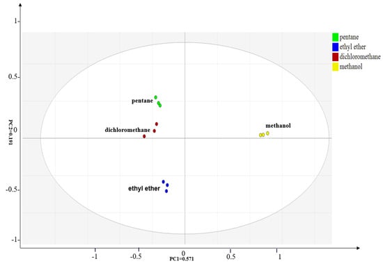 Score plot of volatile compounds in the dry-rendered beef fat using four extraction solvents (pentane, ethyl ether, dichloromethane, and methanol) for solvent-assisted flavor evaporation combined with gas chromatography–mass spectrometry (SAFE/GC−MS) analysis.