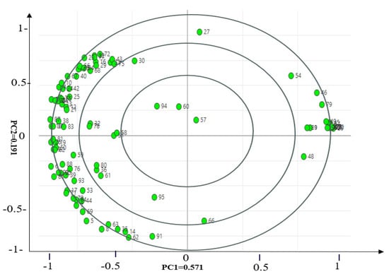 It could be seen from Figure 3 that the position of the most volatile compounds was well correlated with the position of dichloromethane and pentane on the score plot of Figure 2. This indicated that dichloromethane and pentane extraction had a strong positive correlation with the most volatile compounds. Moreover, the position of ethyl ether in Figure 2 also showed as being somewhat well correlated with the most volatile compounds in Figure 3, indicating that ethyl ether extraction also had certain positive correlation. In other words, the aforementioned three solvents displayed good performance in the extraction of the most volatile compounds. However, methanol was not a good extraction solvent, because it was far away from the most volatile compounds on the loading plot (Figure 3). The above results were consistent with the above heat map analysis and GC−MS analysis results.