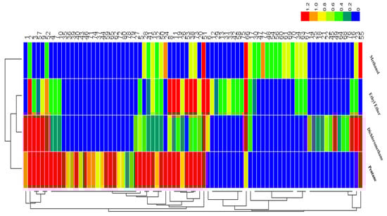 Moreover, GC–MS results (Table 2) were processed via heat map and principal component analysis (PCA), as shown in Figure 1 and Figure 2, respectively. As illustrated in the legend (Figure 1), the colors of the block from red to blue indicated that the compounds were present from higher to lower levels. It could be seen from Figure 1 that the volatile components found by SAFE/GC–MS using dichloromethane, pentane, and ethyl ether as the extraction solvents were similar, which had a markedly greater number of identifications than by methanol extraction. Methanol only extracted a small number of compounds due to its high polarity. Figure 2 shows that the contribution rate of the first principal component was 57.1%, the second principal component was 19.1%, and the cumulative contribution rate was 76.2%, indicating that the PCA analysis represented most of the information of the original variables and the analysis results were reliable. According to the score plot (Figure 2), the samples of pentane, ethyl ether, and dichloromethane were distributed closer, indicating that volatile composition extracted using the three solvents had a high similarity. In comparison, the position of the sample point for methanol extraction was far from the position of the points for pentane, ethyl ether, and dichloromethane extraction, which demonstrated the significant difference in extraction effects between them.