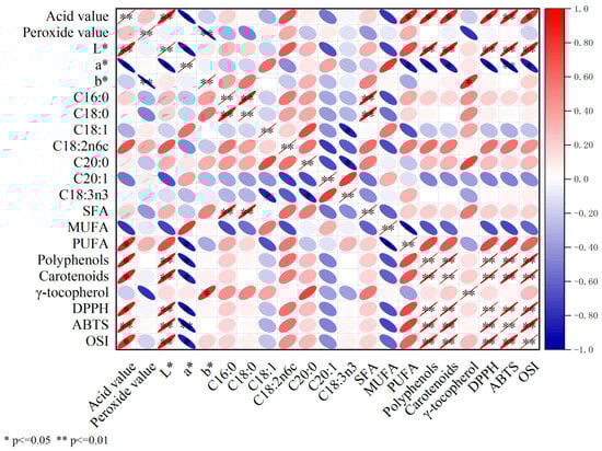 The correlation between the different parameters of samara oil obtained from Elaeagnus mollis Diels kernels extracted by solvent and mechanical methods. Red means positive correlation and blue means negative correlation; the scale ranged from −1 to 1; *, p ≤ 0.05 (significant); **, p ≤ 0.01 (highly significant); L*, lightness; a*, greenness to redness; b*, blueness to yellowness; C16:0, palmitic acid; C18:0, stearic acid; C18:1, oleic acid; C18:2n6, linoleic acid; C18:3n3, linolenic acid; C20:0, arachidic acid; C20:1, eicosenoic acid; SFA, saturated fatty acid; MUFA, monounsaturated fatty acid; PUFA, polyunsaturated fatty acid; DPPH, 2,2-diphenyl-1-picrylhydrazy; ABTS, 2,2′-azino-bis(3-ethylbenzothiazoline-6-sulfonic acid) diammonium salt; OSI, oxidative stability index.