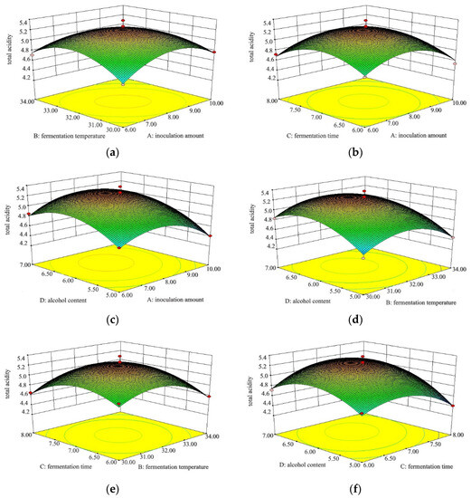The total acidity content has a direct impact on the quality of fruit vinegar and is an important indicator with which to verify the good character of fruit vinegar in China [29]. In Figure 1a–f, the three-dimensional response surface plots describe the interaction effect of the fermentation parameters. In response to the total acidity, the one-time item inoculation amount of acetobacter (A), fermentation temperature (B), and alcohol content (D), interaction terms AB and CD, and quadratic terms A2, B2, C2, and D2 were significant (p < 0.05). The other items had no significant differences (p > 0.05).
