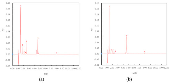 Seven organic acids were analyzed in a high-performance liquid chromatography (HPLC) system equipped with a chromatographic column (Acquity UPLC-HSS-T3, 2.1 mm × 100 mm, 1.8 µm, Waters, Milford, MA, USA) used for identification and analysis of organic acids at 210 to 230 nm in the ultraviolet detector [22,23]. Organic acid standards (1) oxalic acid, (2) tartaric acid, (3) lactic acid, (4) acetic acid, (5) citric acid, (6) malic acid, and (7) succinic acid were used for the identification and quantification of organic acids in green jujube vinegar.