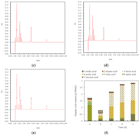 Analysis of organic acids during the fermentation of green jujube vinegar by HPLC, (1) oxalic acid, (2) tartaric acid, (3) lactic acid, (4) acetic acid, (5) citric acid, (6) malic acid, and (7) succinic acid; (a) fresh jujube juice, (b) alcohol fermented for 7 days, (c) acetic acid fermented for 7 days, (d) green jujube vinegar aged for 1 month, (e) green jujube vinegar aged for 2 months, and (f) analysis of total organic acids in the fermentation of green jujube vinegar.