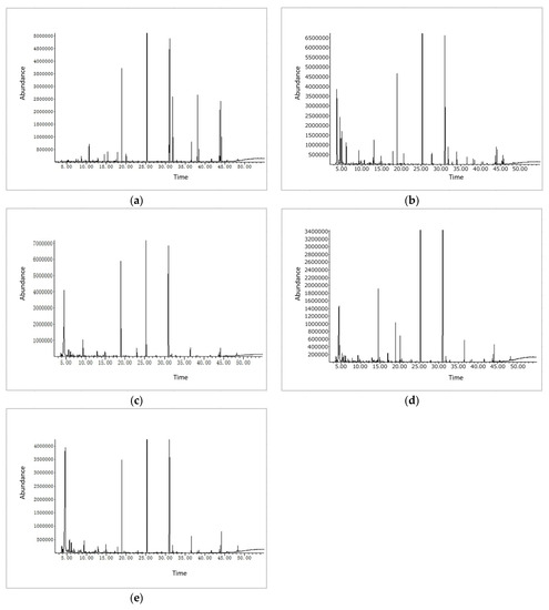 The volatile compound was the direct influencing factor in the sensory evaluation of the fruit vinegar and was also an important index in the evaluation of the quality of the fruit vinegar. The changes in volatile components in fruit vinegar are usually related to a series of chemical reactions and microbial metabolism during fermentation and aging. In this study, the volatile substances in the fermentation and aging of green jujube vinegar were identified and analyzed by HS-SPME and GC-MS, and the total ion chromatograms are shown in Figure 3a–e. A total of 61 compounds were identified and quantified in the fermentation and aging processes, including 6 alcohols, 6 acids, 8 aldehydes, 27 esters, 6 hydrocarbons and derivatives, 3 ketones, and 6 other volatile compounds.