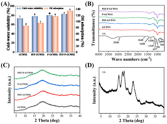- Pulsed electric field-treated granular cold-water-soluble starch (PEF-GCWSS): Similar to the preparation method of GCWSS, pulsed electric fields-pretreated granule cold-water-soluble starch (PEF-GCWSS) was obtained by replacing corn starch with PEF-CS.