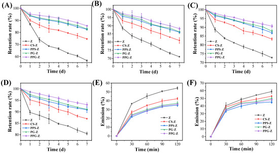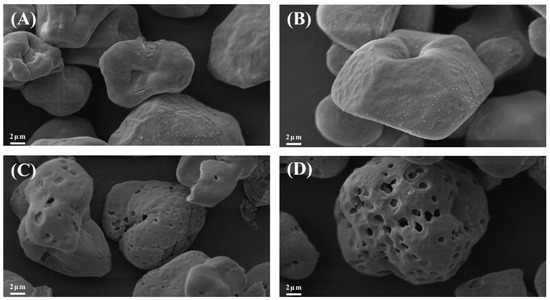 - Porous starch (PS): Corn starch was dissolved in acetic acid sodium acetate (Hac-NaAc, pH = 5.0) buffer solution with a concentration of 30% (m/m). Starch dispersion was stirred and activated for 30 min under water bath conditions at 50 °C. The enzymatic hydrolysis method was slightly modified based on the method proposed by Chen et al. [26]. α-amylase and glucose amylase were prepared as composite enzymes in a ratio of 1:1. The sample was enzymatically hydrolyzed for 4.5 h with an enzyme concentration of 2.0%. The precipitates were obtained by centrifuging the sample at 8000 rpm/min for 20 min and were washed 4 times with deionized water and anhydrous ethanol, respectively. After vacuum filtration, drying, and grinding of the precipitated sample, porous starch samples (PS) were obtained.