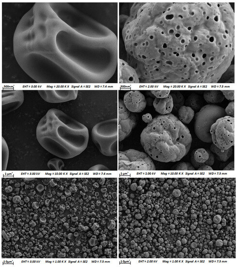 The surface of the propolis microcapsule and the shell materials were scanned with a high-energy beam of electrons in a raster scan pattern. The micromorphology of the samples is shown in Figure 1.