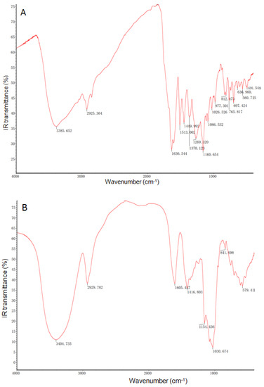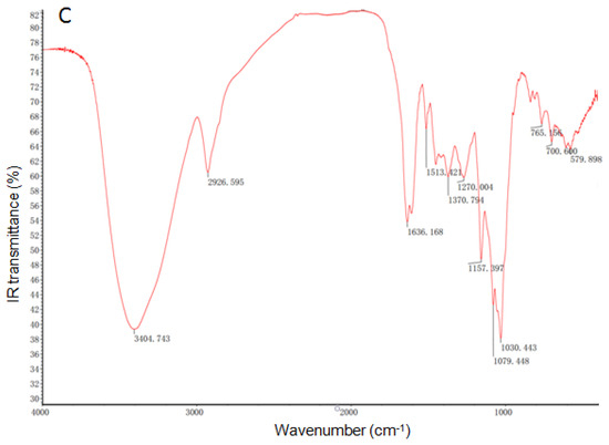 Samples of propolis, shell materials, and propolis microcapsules were fully dried and mixed with potassium bromide (KBr) in a ratio of 1:60 (w:w), superlatively. The FT-IR was determined by Fourier infrared spectrometer (Thermo Scientific iN10, Waltham, MA, USA) at room temperature after samples were ground and tableted. The scanning range was 400–4000 cm−1 at a frequency of 2 cm−1. An average number of 40 scans were obtained from each sample.