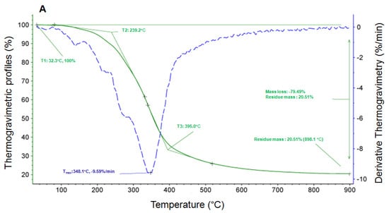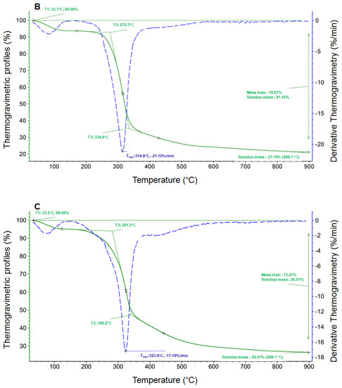 The thermal stability of propolis, shell materials, and propolis microcapsules was determined using a thermogravimetric analyzer (Netzsch TG 209 F3 Tarsus, Selb, Germany). Approximately 3 mg of each sample was placed in an alumina crucible to start the program. The determination conditions were as follows: nitrogen flow rate 20 mL/min, temperature range 50–500 °C with increasing rate of 10 °C/min.