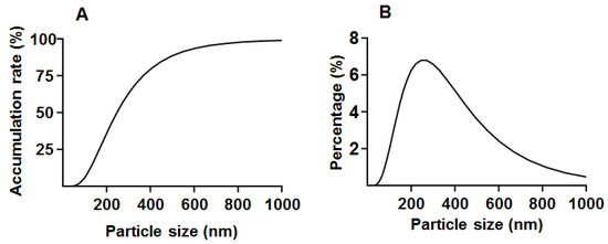 The particle sizes of propolis microcapsules ((A): accumulation rate; (B): percentage).