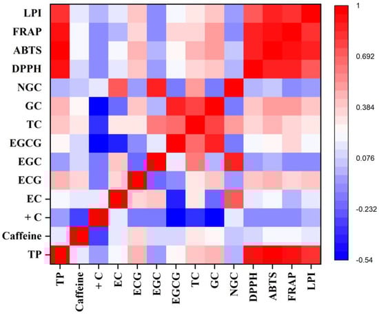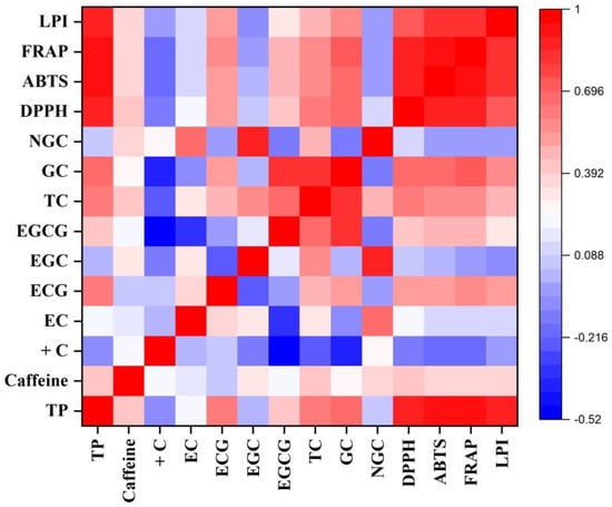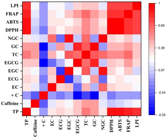 Heatmap of a correlation matrix between biochemical constituents and antioxidant activity in autumn. TP: total polyphenol; +C: (+)-catechin; EC: (−)-epicatechin; ECG: (−)-epicatechin-3-gallate; EGC: (−)-epigallocatechin; EGCG: (−)-epigallocatechin-3-gallate; TC: total catechin; GC: galloylated catechins; NGC: non-galloylated catechins; DPPH: DPPH radical scavenging activity; ABTS: ABTS radical scavenging activity; FRAP: ferric-reducing antioxidant potential; LPI: lipid peroxidation inhibition activity.