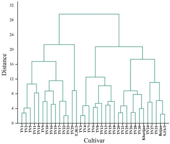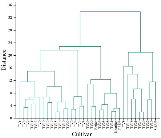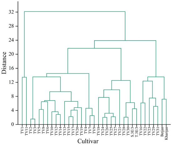 A hierarchical cluster analysis (HCA) was applied to identify the presence of homogenous groups among the cultivars based on TP content in each harvesting season separately (Figure 4, Figure 5 and Figure 6). HCA was applied to the distance-based idea that nearby cultivars are more related than those far away. For example, the dendrogram of TP content in the pre-monsoon season (Figure 4) presents different homogeneous groups such as TV2 and TV3, TV4 and TV5, etc.
