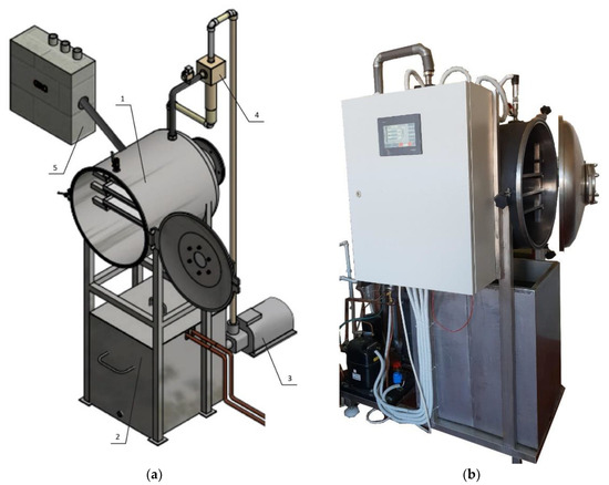 3D view of a prototype of an innovative vacuum dryer with an ejector system: 1. chamber; 2. cooled water tank; 3. centrifugal pump; 4. ejector; 5. PLC control unit (a); Prototype of an innovative vacuum dryer with an ejector system installed in the laboratory (b).