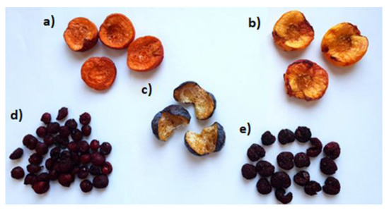 The samples of stone fruit dried with the vacuum dryer with an ejector system: (a) apricot; (b) peach; (c) plum; (d) sour cherry; (e) sweet cherry.