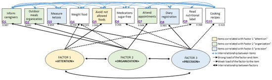 The authors created a graphical presentation to illustrate the inter-relationships between factors and items, based on all the analyses performed (Figure 1). The graphic representation shows three factors and all the questionnaire items. The authors proposed the names of the factors as follows: factor 1, “attention,” which is mainly related to item 5 (avoiding eating foods not prescribed); factor 2, “organization,” which is mainly related to items 1, 2, and 7 (reporting the therapy to all family, preparing meals that allow you to follow the diet even when away from home, and attending appointments); and factor 3, “precision,” which is related to items 3 and 8 (measuring ketosis and filling out food and seizure diaries).