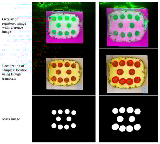 Finally, the best registration function was selected considering the lowest value of error metrics for the 60 fruit slices examined, resulting in low registration errors using the affine transformation function (Figure 2). Subsequently, the registered images were processed using the Hough transform method to extract the samples’ location on the slices, which are circular []. Since the location of the samples extracted from each fruit slice was determined in the mask image, the mean spectra of the pixels in each segmented sample was used as the spectral signature related to that sample for subsequent analysis. Image registration and mask generation were performed in MATLAB programming environment ver. R2015b (The MathWorks, Inc., Natick, MA, USA). Implementation of the mask image on hypercubes and the extraction of samples mean spectra were performed in ENVI (ver. 4.8, L3HARRIS, Melbourne, FL, USA).
