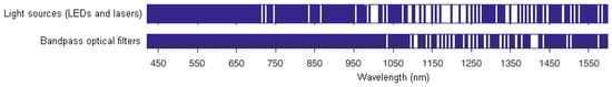 An overview of commercially available optical resources in the range 420–1600 nm (wavelength interval: 5 nm). The available wavelengths are shown in blue.