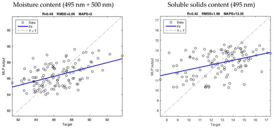 The chemical composition of fresh-cut pineapple samples was predicted by MLP models using light reflectance at selected wavelengths (Table 4). The results showed that the R and error metrics were very close between the calibration and cross-validation stages, indicating MLP models are performing well, i.e., good precision, and are not overfitting. The R for calibration and cross-validation indicated a moderate correlation between the predicted values and the reference values for MC, SSC, and CC. Except for CC, the error metrics indicated a low difference in predicted values with the reference ones, especially for MC. The higher values of the error indicate that MLP models are not very reliable for the prediction of CC using selected wavelengths.