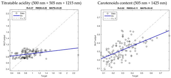 The MLP models calibrated by superior selected wavelengths were tested using the validation dataset (Figure 4). The results indicated that the models were able to predict the MC (%) and SSC (%) with good accuracy. TA (%) showed a degree of accuracy similar to the cross-validation stage, with values of 0.37 for R, 0.26 for RMSE, and 24.28–24.80% for the MAPE in the validation stage. For CC (mg/100g DM), the error metrics in the validation stage were better than those in the calibration and cross-validation stages, 0.11 for RMSE, and 39.42% for MAPE. These results demonstrate the potential of the models developed in this study to non-invasively predict the parameters of interest, especially for MC and SSC.