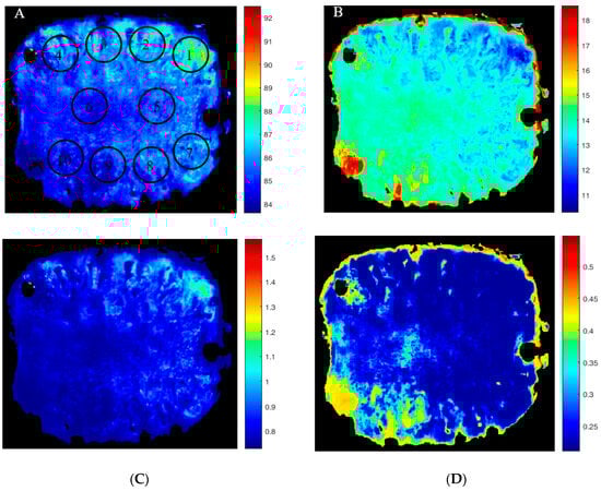 Example of pseudo-color spatial distribution maps of chemical composition for a slice of fresh-cut pineapple, which was separated out for validation of MLP models: (A) moisture content in % (495 nm + 500 nm), (B) soluble solids content in % (495 nm), (C) titratable acidity in g/100 mL (500 nm + 505 nm + 1215 nm), and (D) carotenoids content in mg/100g DM (505 nm + 1425 nm). Circles and digits show the regions and their corresponding number, respectively, in which samples were taken for measurement of reference tests.