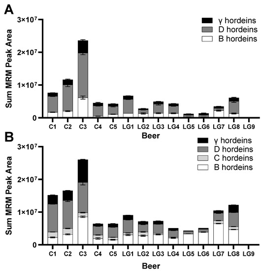 - Colgrave, M.L.; Goswami, H.; Howitt, C.A.; Tanner, G.J. What is in a Beer? Proteomic Characterization and Relative Quantification of Hordein (Gluten) in Beer. J. Proteome Res. 2012, 11, 386–396. [Google Scholar] [CrossRef] [PubMed]