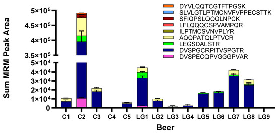 3.2.2. Identification of Hordein Peptides in LG Beer