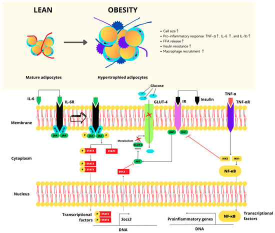 Molecular perspective for hypertrophy of adipose cells. Arrow: indicates the connection of the IL-6R to its receptor and its activation. Red cross: indicates blockages in transcription and gene expression agent, thus repressing the expression of the GLUT-4 receptor and consequently preventing the entry of glucose.