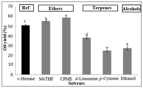 After quantitatively extracting sesame seeds for 8 h with n-hexane, MeTHF, CPME, Ethanol, limonene and p-cymene, extraction yields were determined gravimetrically. As can be seen in Figure 1, the extraction yields were within the 24.64–58.82% range, which was in accordance with the average lipid content of sesame seeds, around 45–60% [10,43].