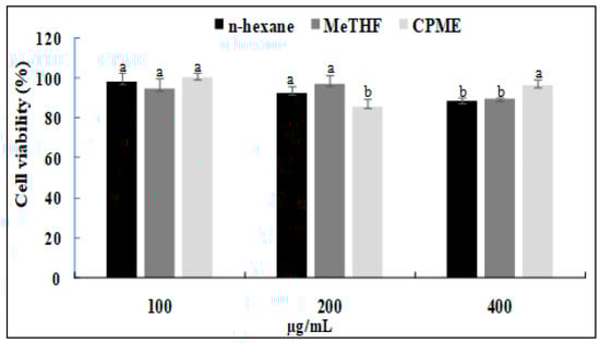 Based on the previous results, the anti-inflammatory activity of only CPME, MeTHF and n-hexane (taken as reference) was evaluated. The cytotoxic effects of conventionally and green-extracted oils on RAW264.7 cells were assessed, and the cells were treated with different sample concentrations (100–400 µg/mL). The results (Figure 3) showed that for the different solvents tested, concentrations of 100, 200 and 400 µg/mL had a negligible effect on RAW cells. Indeed, cell viability was higher than 80%. Therefore, these concentrations of n-hexane-, MeTHF- and CPME-obtained oils were applied for the subsequent experiment.