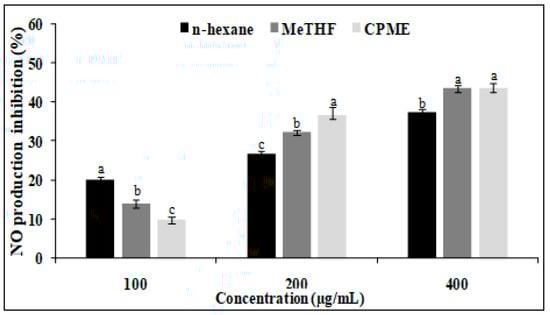 Non-cytotoxic conventionally and green-extracted oils were examined to study their potential to inhibit NO production in LPS-treated RAW 264.7 macrophages. LPS can activate macrophage cells to initiate inflammation and the production of pro-inflammatory mediators such as NO. The oils showed variable and moderate anti-inflammatory activity, depending on tested concentration (Figure 4). For the three oils, the high concentration of 400 µg/mL gives the highest activity. Conventionally extracted oil by n-hexane inhibited NO production by 37%. However, green-extracted oils using MeTHF and CPME exhibited higher anti-inflammatory activity, inhibiting NO production in LPS-stimulated macrophages by 43 and 44%, respectively. Theses oils also displayed higher activity than n-hexane-extracted oil at a dose of 200 µg/mL with inhibition percentages of 32 and 37%, respectively.