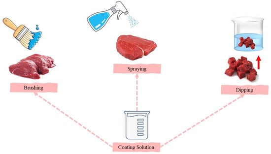 Due to environmental problems, there is currently a global focus on the reduction in waste, in addition to industry demand for cost-effective food preservation methods. As a result, films and coatings from edible biopolymers such as polysaccharides (e.g., alginates, chitosan, pectin, natural gums) and proteins (e.g., zein, whey protein concentrate, collagen, gelatin) have been widely developed [15,16,17,18,19]. Such films or coatings have various advantages over traditional films or coatings from synthetic polymers: edibility, biodegradability, renewability, bioactivity, non-toxicity, being carbon-free or carbon-neutral, reduction in waste, environmentally friendly, and different application methods such as immersion, aspersion, spreading, and brushing (Figure 1) [1,20,21,22]. Additionally, one significant advantage of such films or coatings is the possibility of incorporating various active compounds within their matrix that could even be consumed with the food products, leading to safety enhancement or improvement in nutritional quality and sensory properties [23]. Therefore, the demand for biopolymer-based edible films or coatings incorporated with active compounds has increased.