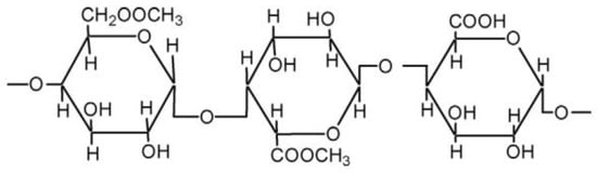 Pectin is a polysaccharide of galacturonic acid units linked by α-(1→4) linkages and is found abundantly in plant cell walls (Figure 3). High concentrations of pectin can be found in the ripened stage of some fruits such as apples and citrus [50,51]. Pectin is produced commercially, having a white to brown color, and is used in the food industry as a gelling, thickening, and stabilizing agent [52,53].