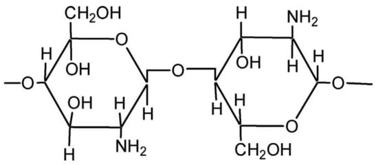 Chitosan is a polymer (Figure 5) obtained from crustacean shells by deacetylation of chitin under alkaline solutions [85]. Chitosan is a non-toxic, safe, renewable, biodegradable, allergen-free, eco-friendly, and biocompatible polymer with health-beneficial properties. It is soluble in acidic pH but highly insoluble in water [86,87]. In addition, chitosan has effective antibacterial activity because of its positive charge. It has been suggested that the primary mechanism of the antibacterial property of chitosan is the electrostatic interactions between the anionic groups of the bacterial cell membrane and the cationic structure of chitosan, leading to membrane permeability and leakage of biological components of the bacterial cell and, finally, cell death [88,89]. However, chitosan has some disadvantages, such as low solubility in neutral and alkaline pH and low mechanical resistance [90].