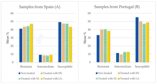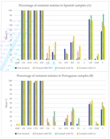 Figure 2 shows the percentages of strains resistant to each of the antibiotics examined after treatment of the samples with SN, Ni and LA. The data for untreated samples are from Rodríguez-Melcón et al. [30]. Major differences were found between compounds, and it was observed that more than 95% of isolates were resistant to OX, FOX, CTX and FEP. Other antibiotics to which high rates of resistance were observed were CIP and F, in strains isolated from minced meat purchased both in Spain and in Portugal.