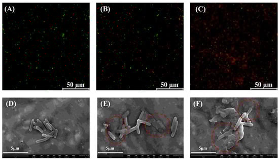 Fluorescence microscope and scanning electron microscopic (SEM) photomicrographs of A. acidoterrestris vegetative cells treated with hesperetin at 0 MIC (A,D control), (B,E) 1 MIC, and (C,F) 2 MIC. Note: the red circle indicates that the cell membrane has been damaged.