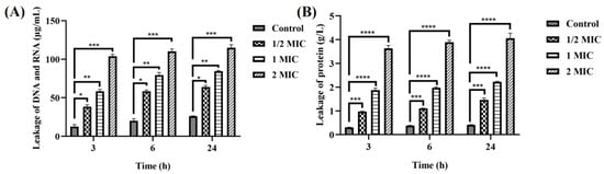 To demonstrate the effect of hesperetin treatment on A. acidoterrestris vegetative cells, the leakage of intracellular content was determined. Figure 3A,B shows the leakage of nucleic acids and protein in A. acidoterrestris vegetative cells under different hesperetin concentrations, respectively. The leakage of nucleic acid increased with the increasing hesperetin concentration. In Figure 3A, the leakage of DNA and RNA in the control bacterial sample at 3, 6, and 24 h were 12.5, 20.12, and 26.03 μg/mL, respectively. After treating the 1/2 MIC hesperetin sample, the corresponding values were 38.26, 58.37, and 63.92 μg/mL. When the concentration reached 1 MIC, the leakage amounts were 59.48, 79.6, and 84.46 μg/mL. Moreover, when treated with hesperetin at the 2 MIC level for 3 h, the leakage of DNA and RNA was 97.39 μg/mL, but there were no significant changes when the exposure time was increased to 6 and 24 h. The same trend was reported in previous studies [,].