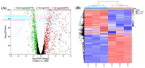 The control and hesperetin-treated samples were clustered separately, as depicted in Figure 4. Cluster analysis is usually used to measure the similarity of expression between samples. Hierarchical cluster analysis was performed based on the expression level of FPKM of differential genes. The cluster analysis results are shown in Figure 4A. Red indicates high gene expression, and blue indicates low gene expression. Samples with similar expression patterns were clustered together. The abscissa represents the clustering of samples, and each column represents one sample. The more similar the gene expression in the samples, the closer they will be. The vertical axis represents gene clustering; each row represents a gene, and the more similar the expression, the closer it is. It can be seen from the overall clustering results that different treatment conditions caused the upregulation and downregulation of some genes involved in the same biological process, indicating that some metabolic processes or cellular pathways play a role in the process of cells being treated with hesperetin []. The volcano plots of the hesperetin-treated and control groups are depicted in Figure 4A. It can be seen intuitively from the figure that compared with the control group, the number of the DEGs was 3056 (expression fold change ≥ 2 and p-value < 0.5). The number of genes upregulated and downregulated in the 1 MIC hesperetin treatment group were 954 and 770, respectively, and there were 1332 genes with a non-significant difference.