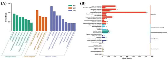 The gene ontology (GO) database (http://www.geneontology.org/) is mainly divided into three functional categories: molecular functions, cellular components, and biological processes. GO functional classification was performed on the gene set, and the results are shown in Figure 5A. It can be seen from Figure 5A that the main biological processes involved are the cell process, metabolic process, organic substance metabolic process, and so on. For the cellular component category, the majority of DEGs were associated with a cellular anatomical entity, a membrane, an intrinsic component of the membrane, and an integral component of the membrane. In terms of molecular function, the most significantly enriched DEGs belonged to catalytic activity, binding, organic cyclic compound binding, ion binding, and so on. Using the KEGG database, all DEGs in the gene set were annotated and analyzed, and the pathway classification diagram is presented in Figure 5B. The majority of DEGs were associated with amino acid metabolism, carbohydrate metabolism, metabolism of cofactors and vitamins, energy metabolism, membrane transport, signal transduction, and so on.