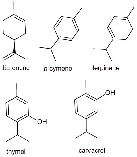 Alcohols, ethers or oxides, aldehydes, ketones, esters, amines, amides, phenols, heterocycles, terpenes (an oxygenated derivative of terpenoids), and polyphenols represent the chemical classes to which belong the constituents of EOs and plant extracts. Some terpene compounds identified in EOs are limonene, β-caryophyllene, β-pinene, α-pinene, α-terpinene, sabinene, β-myrcene, γ-terpinene, cinnamyl alcohol, δ-3-carene, and p-cymene. Limonene is mainly distributed in citrus EOs: orange [13], grapefruit [14], and pomelo [15]. Thymol, carvacrol, and eugenol, deriving from Thymus [16], Origanum [17], and Ocimum [18], represent the main phenolic terpenes associated with EOs obtained from medical and aromatic plants (Figure 1).