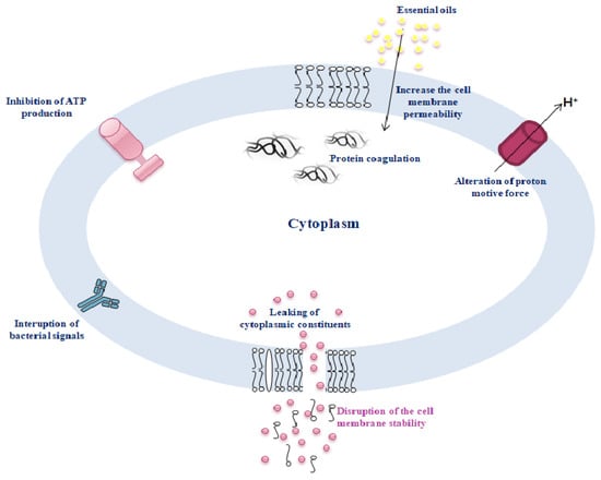 The lipophilic nature of EOs is directly related to their antibacterial activity. EOs destabilize the membrane potential of bacterial cells by disrupting the permeability of the plasma membrane [31]. Degradation of membrane lipid fractions by the EO component thymol leads to destabilization of membrane permeability [32]. EOs affect quorum sensing signaling and can inhibit cell-to-cell communication, e.g., biofilm formation in bacterial cells [33]. Bouyahya et al. (2019) [34] reported the antimicrobial activity of Origanum compactum EO in the context of disrupting cell membrane stability and integrity and increasing membrane permeability, leading to leakage of cellular material (DNA and RNA). Moreover, the effect of EOs on inhibiting biofilm formation in bacterial communities triggers the breakdown of their sensing communication [35]. Few studies report that the mechanisms of action of phenolic compounds in EOs are mainly related to their activity on cell viability and interaction with transcriptional regulators of quorum sensing communication and biofilm formation [36,37]. In addition, EOs can inhibit cell-cell communication and biofilm formation in bacterial cells [33,35]. Martínez et al. (2021) [38] reported the inhibitory effect of Lippia origanoides and Thymus vulgaris EOs (containing thymol–carvacrol) against the biofilm formation of S. aureus and E. coli. In addition, EOs cause leakage of cytoplasmic materials and damage to the plasma membrane, leading to the efflux of DNA, RNA, and proteins in bacteria [39]. Han et al. (2020) [40] investigated the antibacterial activity of limonene against Listeria monocytogenes and concluded that limonene at a concentration of 20 mL/L can destroy the cell wall and cell membrane, leading to leakage of proteins and nucleic acids. By inhibiting ATPase activity, limonene could inhibit ATP synthesis and respiratory chain complex activity. The effect of EOs during biosynthesis occurs via proton motive force through degradation of the plasma membrane, potential disruption of the electron transport system, proton pump disintegration, and ATP depletion [34].
