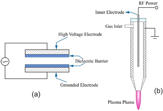 Illustration of (a) dielectric barrier discharge and (b) plasma jet. Reprinted from [] with permission from Elsevier.