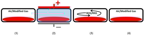 A DBD plasma generation setup consist of two metal electrodes, at least one coated with a dielectric layer, with a high potential difference applied across them [] (Figure 1). The distance between the electrodes varies in different studies, and can be up to several cm []. Exposing the gas to the electric field at room temperature generates a small percentage of ionized gas, resulting in formation of reactive plasma species such as ROS and RNS, depending on the composition of the treatment gas [].