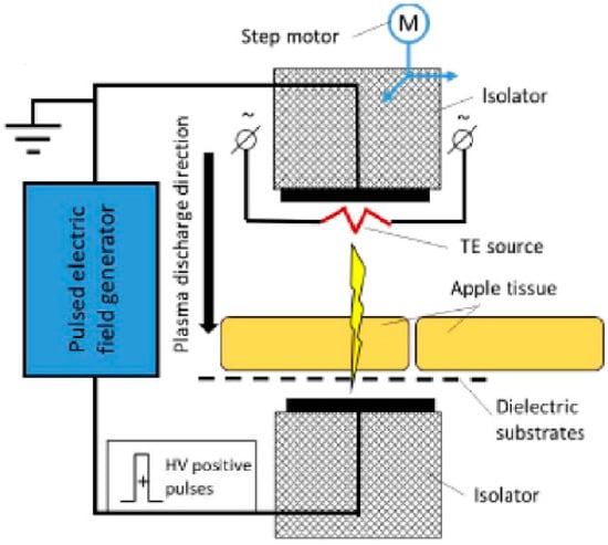 Another recent development within ACP technology is its use as a drying pretreatment technology, primarily for fruits and vegetables []. One such pretreatment ACP method is cold filamentary microplasma (CFM). CFM creates a thin plasma channel by a high voltage, non-self-sustained gas discharge between two metal electrodes in a gaseous medium equipped with permanent magnets to create a concentrated discharge [,]. With this technique, it is possible to penetrate the entire food product as opposed to treating only the surface (Figure 3) [].