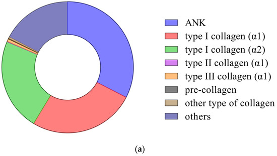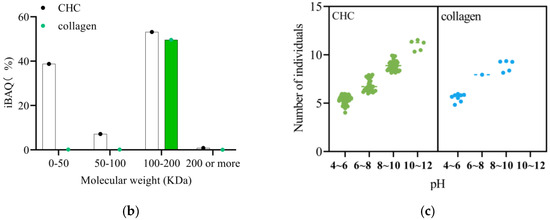 Protein composition, molecular weight, and pI distribution in CHC and identified collagens. (a) Protein composition; (b) molecular weight; (c) pI. Other types of collagen are represented: type IV collagen (α2), type V collagen (α1, α2, α3), type VI collagen (α1, α2, α3), and type Ⅺ collagen (α1, α2).